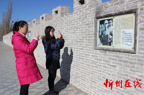 1月6日,山西農(nóng)業(yè)大學(xué)就讀的原平學(xué)子朱麗娟,利用在市新聞辦學(xué)習(xí)的機(jī)會(huì),與學(xué)姐常璐來到該市崞陽鎮(zhèn)文化墻觀看續(xù)范亭將軍生平和毛澤東題詞的老照片。為了緬懷歷史,記住鄉(xiāng)愁,崞陽鎮(zhèn)搜集了40余幅抗日戰(zhàn)爭(zhēng),解放戰(zhàn)爭(zhēng)時(shí)期的老照片,鑲嵌在文化墻上,供人們參觀。(曹申義 攝)