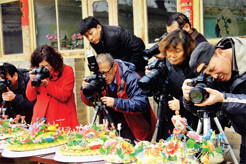 近日,中國(guó)民俗網(wǎng)、中國(guó)旅游網(wǎng)攝影記者和業(yè)余攝影愛好者30余人聚集在原平市衛(wèi)村面塑藝人趙佩云家中,全程拍攝山西非物質(zhì)文化遺產(chǎn)面塑食品的制作過(guò)程。面塑是山西民間喜聞樂(lè)見的一種食品,原平市衛(wèi)村面塑藝人趙佩云融合了歷史文化和民間藝術(shù),制作的面塑做工考究,形式多樣,色澤艷麗,受到了人們的追捧,吸引了眾多記者的鏡頭。(吉建平 攝)