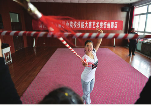 練功房里水袖飛舞。 如今的太雨琴是一名北路梆子劇團(tuán)的演員,隨著走向社會,她越發(fā)感覺到肩頭的重任。傳統(tǒng)戲劇,尤其是北路梆子這樣的地方少數(shù)劇種,那種萬人爭睹的景象已經(jīng)一去不復(fù)返了?,F(xiàn)在除了一些縣鄉(xiāng)的節(jié)日慶典,很少有人愿意花錢到劇場觀看。這樣一來,北路梆子也就面臨著演出市場萎縮、大量演員流失的狀況。與其說太雨琴在靠戲曲吃飯,不如說她在用信念堅持。(何光暉 攝影報道)