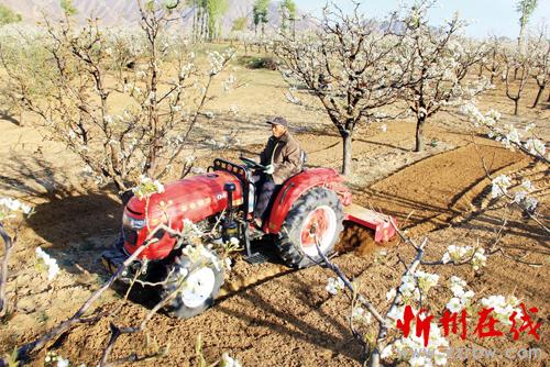 4月16日,原平市子干村民正在萬畝梨園搶墑春耕春播。原平市農(nóng)業(yè)、農(nóng)機(jī)、農(nóng)業(yè)技術(shù)推廣中心通過“現(xiàn)場(chǎng)直播”的方式,與鄉(xiāng)村進(jìn)行對(duì)接,把旱地發(fā)展林果業(yè)和套播雜糧機(jī)播作為“一村一品”的特色之路,根據(jù)果樹樹冠的大小,合理確定種植小雜糧的品種和規(guī)模,實(shí)現(xiàn)了林糧兩不誤,收入大提高。(吉建平 攝)