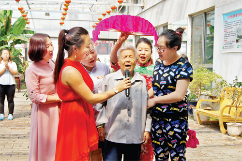 一首熱鬧紅火的《開門紅》秧歌舞拉開了文藝表演的序幕,節(jié)目種類豐富多樣,老人們?nèi)褙炞⒌挠^賞。一位94歲老人精彩的表演把節(jié)目推向高潮。院內(nèi)歡聲笑語(yǔ),熱鬧非凡。