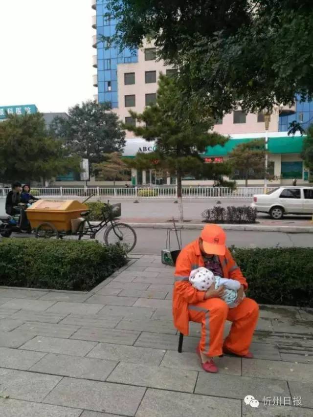 (五)創(chuàng)衛(wèi)工作如火如荼,環(huán)衛(wèi)女工扔下嗷嗷待哺的女兒投身在創(chuàng)衛(wèi)工作。環(huán)衛(wèi)女工正在清掃路面垃圾,母親帶孩子來找她喂奶,孩子吃飽后,又把孩子交給母親,邊鏟除口香糖,邊望著遠(yuǎn)去的親人,滿臉的依依不舍。(董蘊(yùn)宜 攝)