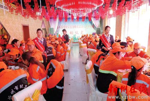 中午12時(shí),身著工作服的環(huán)衛(wèi)工人陸續(xù)到來,他們被熱情的餐廳服務(wù)人員請到了座位上。為了接待好環(huán)衛(wèi)工人用餐,當(dāng)天店內(nèi)騰出了一樓大廳的桌位,并進(jìn)行了精心布置。忙碌了一上午的環(huán)衛(wèi)工人坐在寬敞的就餐大廳里有說有笑,場面十分溫馨。