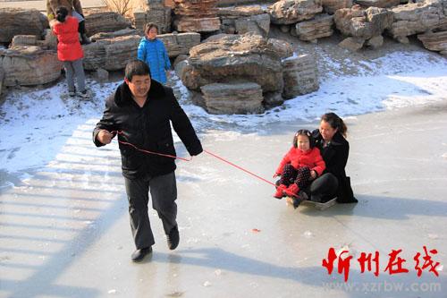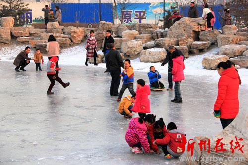 寒冬時(shí)節(jié),冰封的湖面成了孩子們的樂(lè)園。12月17日,原平市文體廣場(chǎng)封凍的水面上一撥又一撥帶著孩子的家長(zhǎng)腳步匆匆地趕來(lái),孩子們?cè)诤嫔湘覒颍?chē)的、打出溜的、滑冰的……玩得特別開(kāi)心。(吉建平 攝)