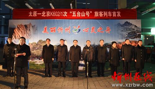 本報(bào)訊(記者 楊峰雷)1月11日晚23時(shí)20分,車廂標(biāo)有“美麗忻州心靈之舟”及五臺(tái)山標(biāo)志性古建大白塔圖案、由太原開往北京的K602次列車緩緩駛?cè)胄弥菡?,這標(biāo)志著“五臺(tái)山號(hào)”列車正式開行。開行首發(fā)儀式在忻州火車站站臺(tái)舉行,市委書記李俊明下達(dá)開行指令,市長(zhǎng)鄭連生、太原鐵路局副局長(zhǎng)劉楓分別致辭。市人大常委會(huì)主任賈雪峰,市政協(xié)主席劉鋼柱,市委常委、宣傳部長(zhǎng)、統(tǒng)戰(zhàn)部長(zhǎng)陳義青,市委常委、秘書長(zhǎng)崔建新出席儀式。市委常委、常務(wù)副市長(zhǎng)趙志堅(jiān)主持。