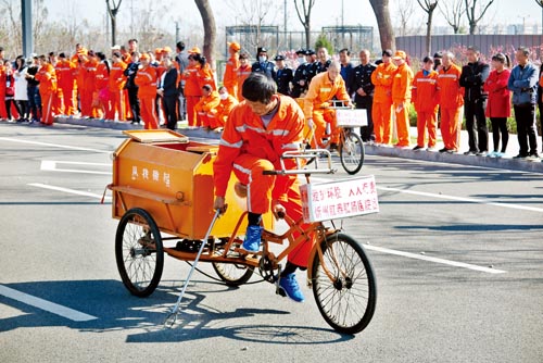 本次活動(dòng)集專(zhuān)業(yè)性和趣味性于一體,在快速保潔技能賽環(huán)節(jié)中,環(huán)衛(wèi)工人們平時(shí)使用的垃圾車(chē)、垃圾夾成為了比賽的道具,參賽者手持垃圾夾、腳蹬三輪車(chē),快速在各自車(chē)道上拾起地上的垃圾,放置在三輪車(chē)箱內(nèi),拾完所有垃圾用時(shí)最短者獲勝。參賽者崔改花說(shuō):“其實(shí)比賽比平時(shí)干活累,因?yàn)槔O(shè)置的間距小、數(shù)量多,還要搶時(shí)間、不能串跑道,再加上心理緊張。不過(guò)參加比賽的過(guò)程是開(kāi)心的?!眱扇藠A氣球和三人騎車(chē)將比賽帶入了高潮,參加兩人夾氣球比賽的李志華說(shuō):“我很喜歡這樣的活動(dòng),大家能放松心情,還能在比賽過(guò)程中增進(jìn)友誼,還豐富了我們環(huán)衛(wèi)工人的業(yè)余生活?!?/p>