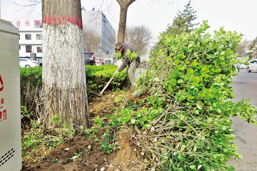 4月10日,長(zhǎng)征街改造前期工作已經(jīng)開(kāi)始,道路中心綠化帶喬灌木開(kāi)始大“搬家”了。在現(xiàn)場(chǎng)記者看到,市園林部門組織工人正在把道路兩旁綠化帶里的灌木一一挖出。據(jù)現(xiàn)場(chǎng)工作人員介紹說(shuō):挖出的灌木將全部移植到新修道路或公園內(nèi)。圖為園林工人正在給灌木“搬家” 張志遠(yuǎn) 攝