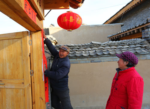 除夕早上,岢嵐縣宋家溝移民新村,沈姚付兩口子正在貼春聯迎新春。張林平 攝