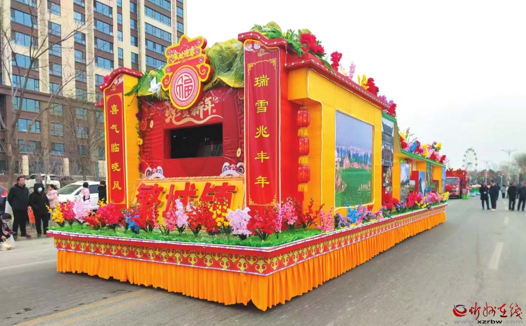 正月十四上午九時,六輛精心設(shè)計的主題彩車沿濱河路徐徐前行:東城街村彩車兩側(cè)以超大電子屏播放全鎮(zhèn)發(fā)展風貌與規(guī)劃;南城街彩車以滿載果蔬的渡輪形象寓意豐收與希望;北城街彩車在花的海洋中展示本土名優(yōu)特產(chǎn)品與風景名勝;西城街彩車以高山起伏的造型展示繁城鎮(zhèn)特色果品和農(nóng)牧產(chǎn)業(yè)概況;南關(guān)村彩車以“繁榮盛峙”造型展現(xiàn)紅旗模范村的責任擔當;西義村彩車通過“高臺表演”形式營造歡樂喜慶的氛圍。每輛彩車高達5米,吸引了眾多群眾駐足觀看,紛紛舉起手機記錄這“行走的民俗畫卷”。