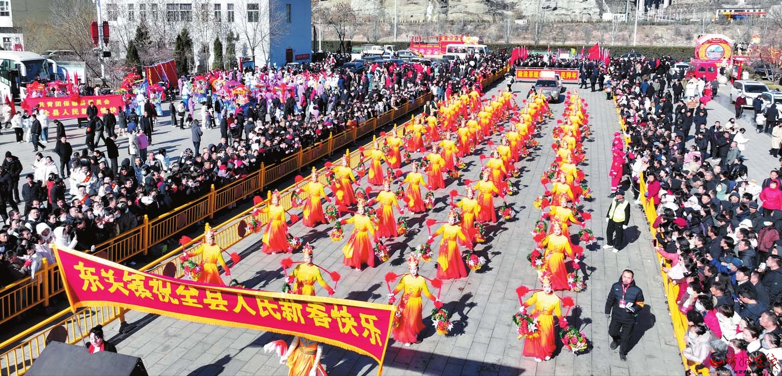 2月22日,縣城同舟廣場(chǎng)成為這場(chǎng)文化盛宴的中心舞臺(tái)。14支特色方陣、兩千余名參演者齊聚一堂,為全縣人民獻(xiàn)上了一場(chǎng)融合非遺精粹、民俗風(fēng)情與時(shí)代新韻的文化大餐。上午9時(shí),義門(mén)鎮(zhèn)的威風(fēng)鑼鼓隊(duì)率先擂響春雷般的鼓點(diǎn),拉開(kāi)展演序幕。隨后,保德大秧歌、黃河旱船、安塞腰鼓等節(jié)目輪番登場(chǎng)。金色巨龍騰空翻躍,舞獅表演靈動(dòng)威猛,秧歌隊(duì)伍歡快喜慶,將黃土地上的蓬勃生機(jī)展現(xiàn)得淋漓盡致。除了傳統(tǒng)民俗表演,教師方陣、軍樂(lè)隊(duì)、夕陽(yáng)紅文藝宣傳隊(duì)等也紛紛登場(chǎng),精彩的表演詮釋著保德人民對(duì)美好生活的追求。