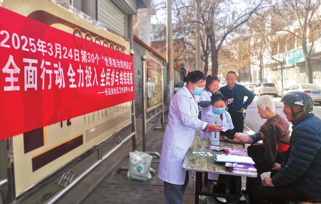 3月24日,是第30個世界防治結(jié)核病日。為進一步動員社會各界廣泛參與,增強公眾健康意識,推動全市結(jié)核病防治工作,市衛(wèi)健委組織開展了世界防治結(jié)核病日系列宣傳活動。圖為忻府區(qū)長征街社區(qū)衛(wèi)生服務(wù)中心醫(yī)護人員為群眾測量血壓。 (記者 宮清華攝)
