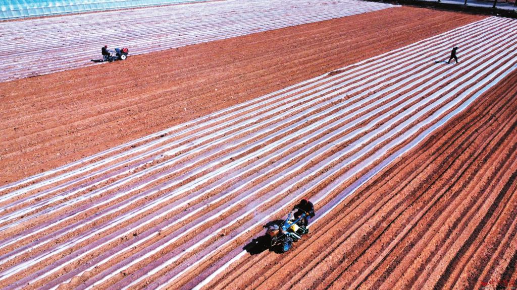 春光明媚農(nóng)事忙,原平市子干鄉(xiāng)田間,農(nóng)民正在覆蓋地膜。連日來(lái),該市搶抓農(nóng)時(shí),全力開(kāi)展春耕備耕工作,地頭一片忙碌景象。 (褚震 攝)