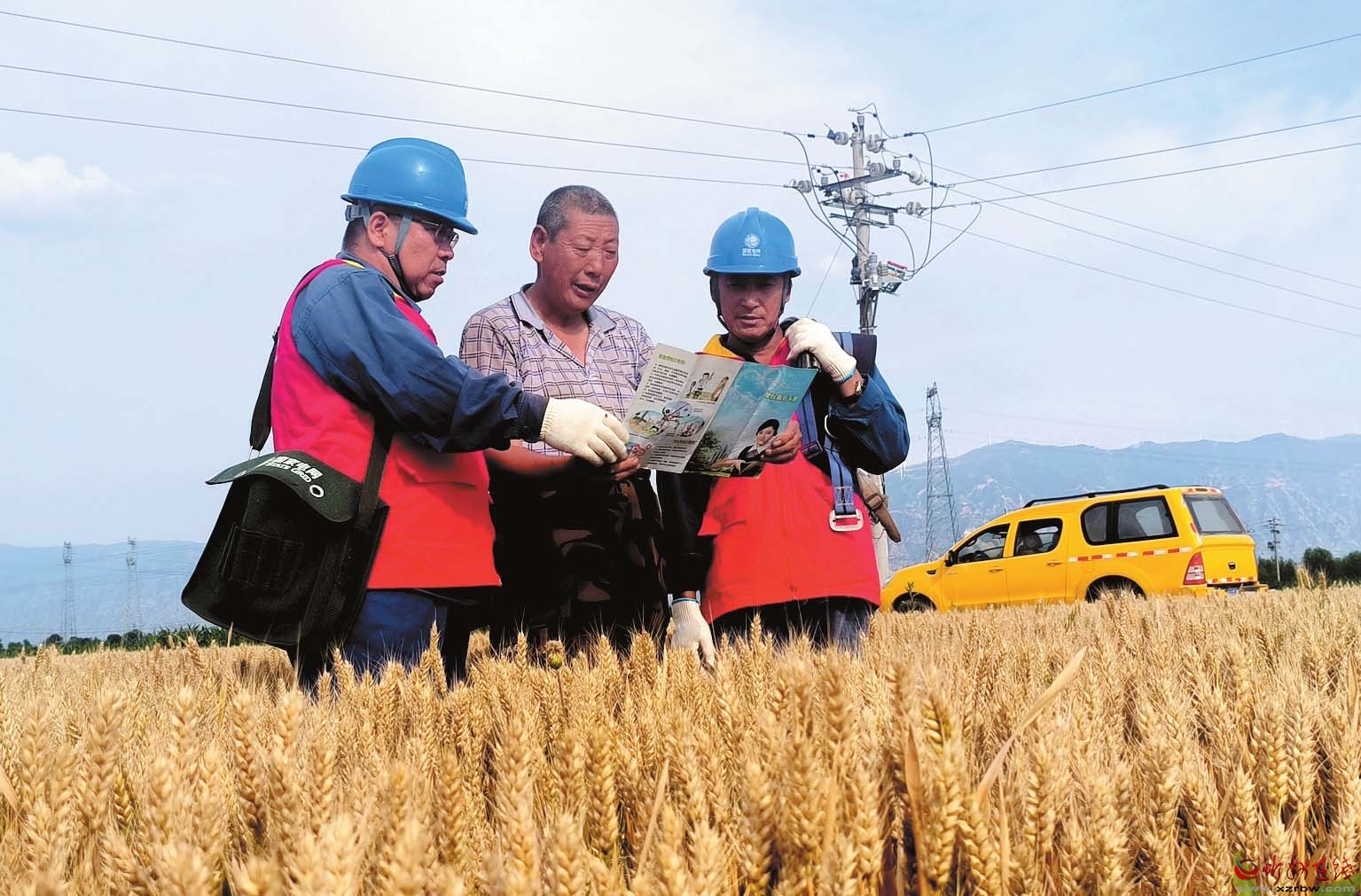 6月24日,在忻府區(qū)義井鄉(xiāng)北湖村小麥示范田里,機聲隆隆,麥浪滾滾。一臺臺聯(lián)合收割機來回穿梭,時不時停下來裝卸金燦燦的麥粒。在這滾燙的豐收場景中,一對身著“紅馬甲”的電力巡線員格外醒目,他們行進在田埂之上,身影在麥浪與驕陽之間躍動,編織起一道無形的安全網(wǎng)。