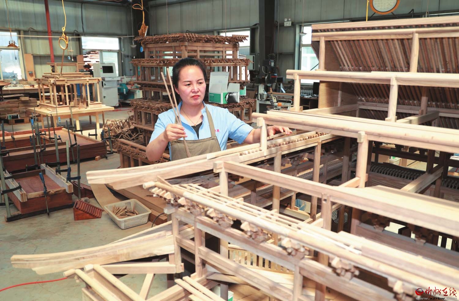 7月21日,在五臺現(xiàn)代農業(yè)產業(yè)園區(qū)森雅軒古典家俱有限公司的加工車間,工人正在制作工藝品。森雅軒采用傳統(tǒng)工藝制作,以古典家具、全屋定制、工藝品、老榆木系列產品四大生產板塊為主。 (記者 張存良攝)