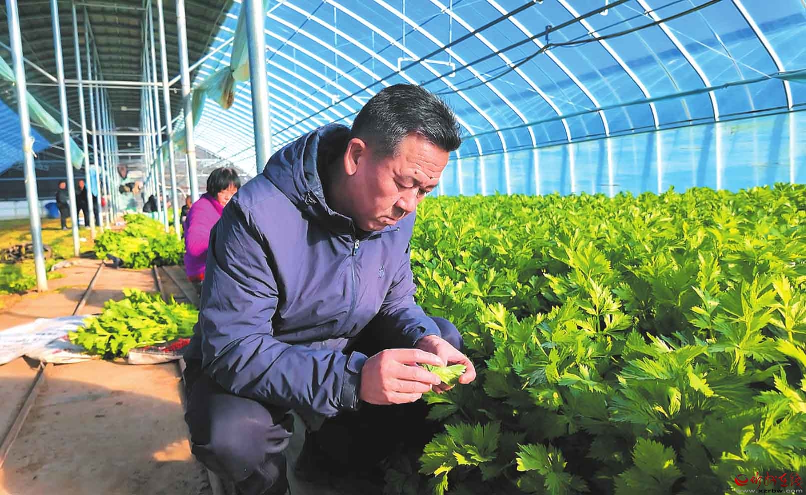 近日,忻府區(qū)農(nóng)業(yè)農(nóng)村局組織農(nóng)技專家團(tuán)隊(duì)深入忻口鎮(zhèn)高標(biāo)準(zhǔn)蔬菜育苗基地,開展越冬作物防寒防凍技術(shù)指導(dǎo)。圖為農(nóng)技專家查看芹菜生長(zhǎng)狀態(tài)。(趙曼君攝)