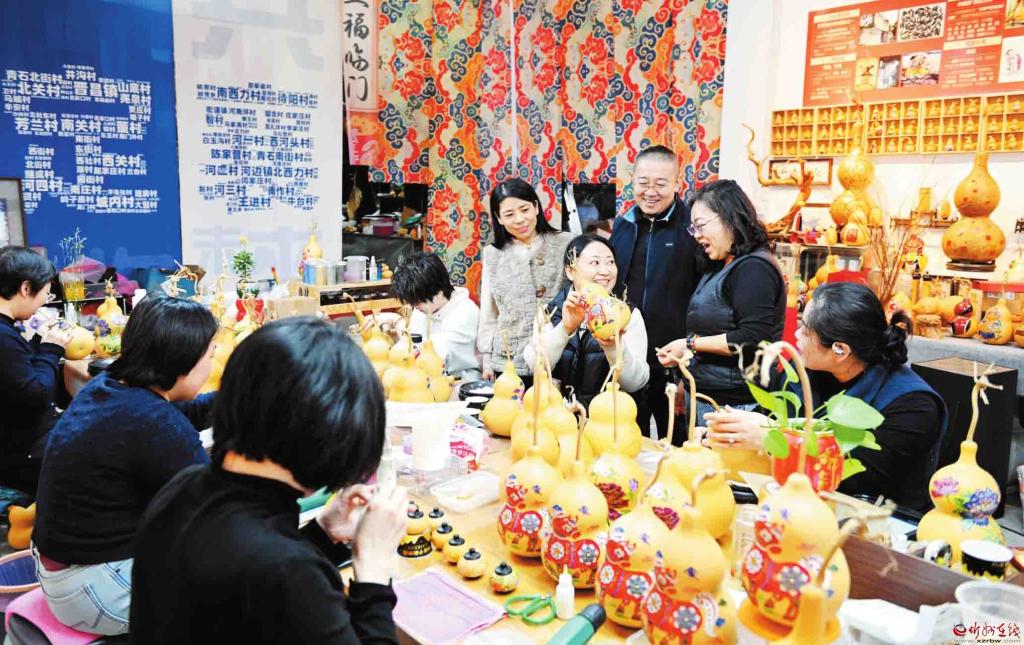 1月17日,定襄縣弘揚(yáng)遠(yuǎn)傳媒有限公司的員工正在趕制一批上海和香港訂制的葫蘆景泰藍(lán)馬年文創(chuàng)產(chǎn)品。(張晉蘭攝)