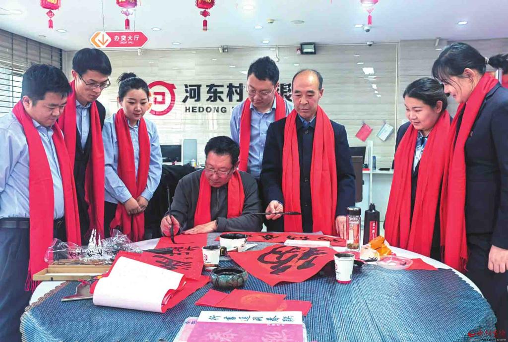 新春到來(lái)之際,神池縣河?xùn)|村鎮(zhèn)銀行邀請(qǐng)當(dāng)?shù)貢◥?ài)好者在營(yíng)業(yè)大廳現(xiàn)場(chǎng)揮毫潑墨,為前來(lái)辦理業(yè)務(wù)的客戶書寫春聯(lián),深受群眾稱贊。(楊晉明攝)