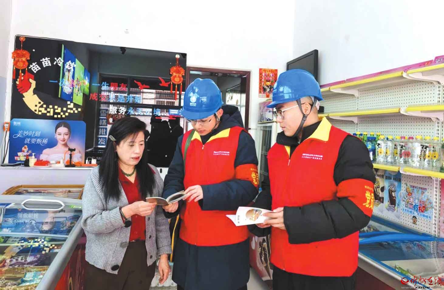 那一抹抹躍動的“電力紅”,穿梭在街巷,堅守在崗亭,全力守護萬家團圓。這滿格電力,不僅點亮了新春,更溫暖了民心。(尤嘉康)圖為黨員服務隊隊員在宣傳安全用電知識。