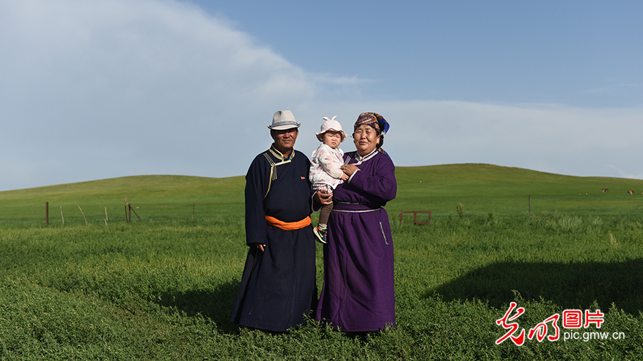經(jīng)過60年的洗禮,當(dāng)年的上海孤兒已經(jīng)和這片草原完美的融為了一起。現(xiàn)在的其日麥拉圖,家門口停著汽車,牛舍里裝著監(jiān)控,五畜齊全,人丁興旺,真正過上了好日子。圖為2020年8月2日,其日麥拉圖夫婦和小孫女在自家牧場。(潘迪攝/光明圖片)