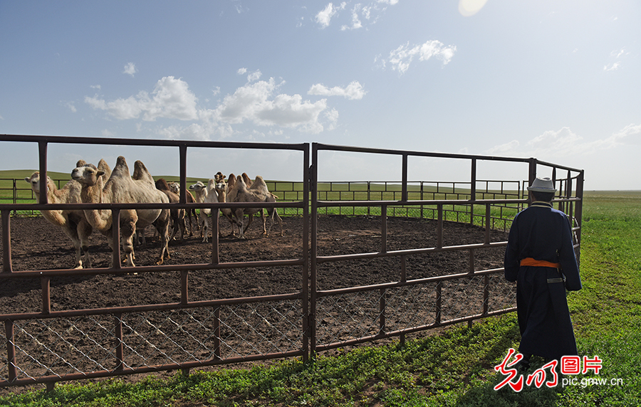 在陳巴爾虎旗,每一個牧民都以家里養(yǎng)著“五畜”為榮。五畜,及綿羊、山羊、牛、馬和駱駝。除了十幾頭駱駝,其日麥拉圖家里還養(yǎng)著90多匹馬,1000多只山羊、綿羊,100多頭牛,真正實現(xiàn)了五畜興旺。圖為2020年8月2日,其日麥拉圖巡視駱駝群的健康情況。(潘迪攝/光明圖片)