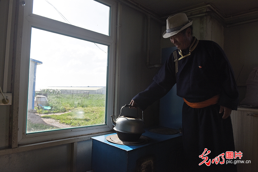 精準(zhǔn)脫貧政策實施以來,在政府的幫助下,其日麥拉圖家在草原上蓋了新房子,生活用品一應(yīng)區(qū)全,其日麥拉圖一家逐漸擺脫了逐水草而居、隨季節(jié)而變的游牧生活。圖為2020年8月2日,其日麥拉圖在家里燒水。(潘迪攝/光明圖片)