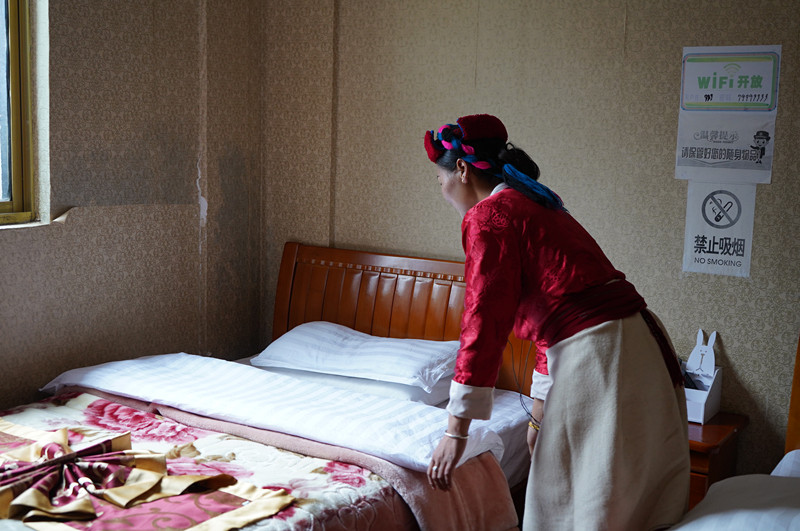 2015年,當(dāng)?shù)卣龀置考颐繎糍徺I了農(nóng)家樂設(shè)施設(shè)備,包括床、電視以及電視柜等。“我這邊有8間房,可以住16個(gè)人。”卓瑪2015年開始經(jīng)營農(nóng)家樂,一樓擺放著一些當(dāng)?shù)靥禺a(chǎn),偶爾還會(huì)給客人提供甜茶、蓋澆飯等。