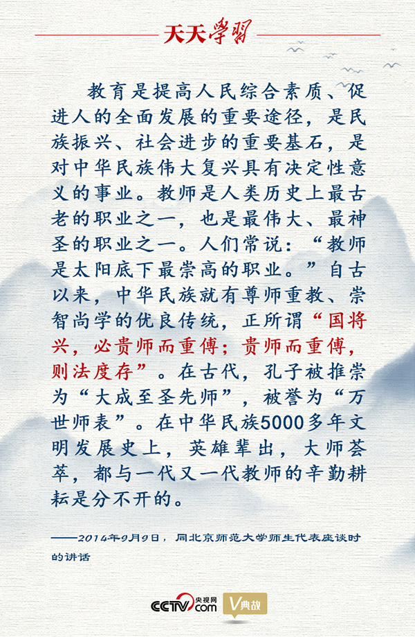 2013年9月9日,正在烏茲別克斯坦進行國事訪問的習近平總書記向全國廣大教師致慰問信,送上節(jié)日祝福,指出全社會要大力弘揚尊師重教的良好風尚,使教師成為最受社會尊重的職業(yè)。