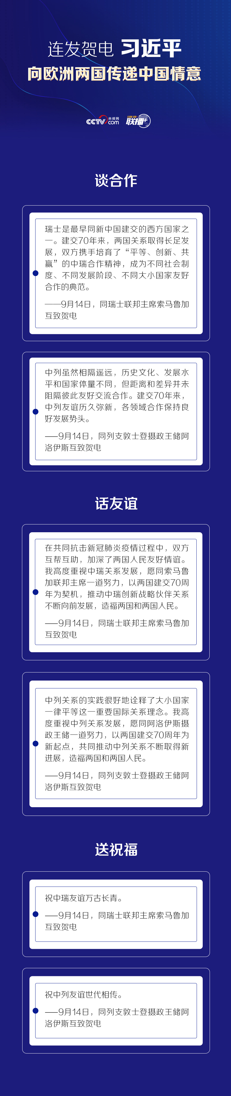9月14日,習(xí)近平主席就中瑞、中列建交70周年,分別同瑞士聯(lián)邦主席索馬魯加、列支敦士登攝政王儲(chǔ)阿洛伊斯互致賀電。