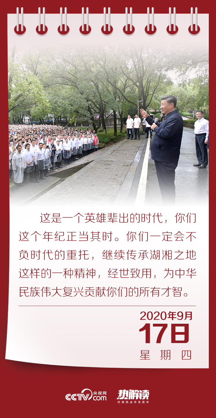 離開(kāi)校園時(shí),習(xí)近平總書(shū)記深情地對(duì)師生們說(shuō):“岳麓書(shū)院一直是我有牽掛,這個(gè)學(xué)院在我們的傳統(tǒng)文化中的地位、影響,我還是很有感觸的?!笨倳?shū)記特別剖析了“惟楚有材,于斯為盛”這副古聯(lián)背后的深意:“于斯為盛,我的體會(huì)一個(gè)就是我們湖南人才濟(jì)濟(jì),代有才人出啊,有報(bào)效祖國(guó)的棟梁之材。再有呢,于斯為盛這個(gè)‘斯’,是指的這個(gè)時(shí)代。明年是第十四個(gè)‘五年規(guī)劃’開(kāi)局之年,是我們開(kāi)啟‘第二個(gè)百年’新征程的起點(diǎn)。這是一個(gè)英雄輩出的時(shí)代,你們這個(gè)年紀(jì)正當(dāng)其時(shí)。”