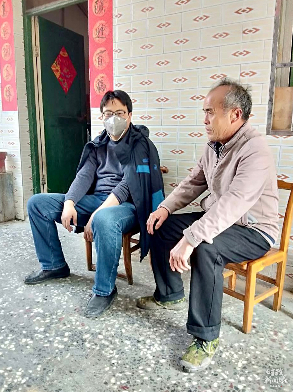 △汝城縣沙洲村扶貧工作隊隊長、村第一書記黃飛(左)看望貧困戶。(總臺央視記者賈林提供)