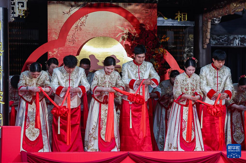 5月20日,18對(duì)新人在浙江省諸暨市西施故里景區(qū)內(nèi)參加以“越風(fēng)有喜·諸事暨成——情定西施故里 愛在浣紗江畔”為主題的集體婚禮。本次集體婚禮旨在倡導(dǎo)文明簡約的婚嫁理念,通過精心設(shè)計(jì)的集體婚禮儀式,為新人打造既莊重又溫馨的婚禮體驗(yàn),既減輕經(jīng)濟(jì)負(fù)擔(dān)、又傳承美好家風(fēng),倡導(dǎo)婚俗改革文明新風(fēng)尚。