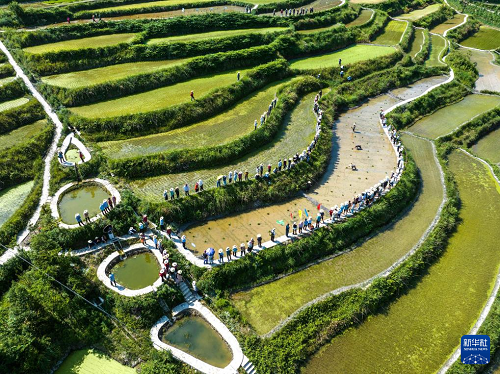 5月21日,湖北省宜昌市秭歸縣兩河口鎮(zhèn)農(nóng)民在二甲村水田里參加插秧比賽(無(wú)人機(jī)照片)。(新華社發(fā) 王罡 攝)