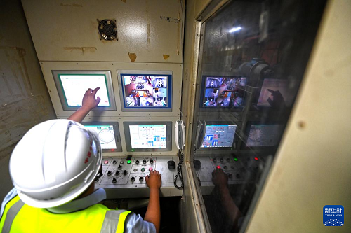 5月26日,施工人員在“青年先鋒號”盾構(gòu)機操作室檢查設(shè)備運行情況。(新華社記者 趙子碩 攝)