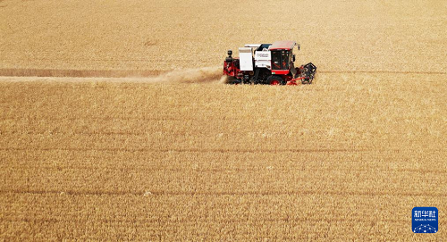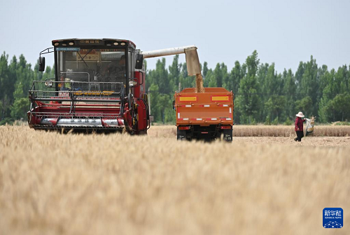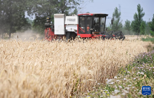 6月2日,農(nóng)機手駕駛聯(lián)合收割機在山東省聊城市茌平區(qū)賈寨鎮(zhèn)草林張村麥田里收割小麥。(新華社發(fā) 趙玉國 攝)