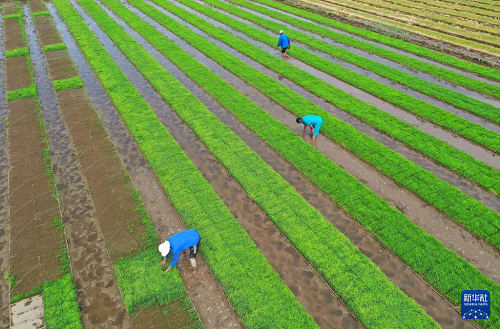 6月2日,山東省青島市即墨區(qū)藍(lán)村街道青香水稻種植合作社的農(nóng)民在搬運秧苗(無人機照片)。(新華社發(fā) 張進(jìn)剛 攝)