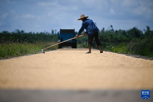6月7日,農(nóng)民在海口市瓊山區(qū)紅旗鎮(zhèn)墨橋村晾曬“瓊山福稻”。(新華社記者 蒲曉旭 攝)