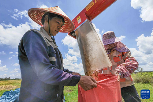 6月7日,農(nóng)民在??谑协偵絽^(qū)紅旗鎮(zhèn)墨橋村將收割機收割的“瓊山福稻”裝袋。(新華社記者 蒲曉旭 攝)