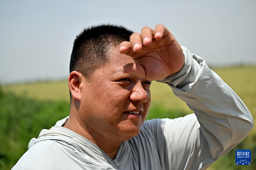 在永濟市虞鄉(xiāng)鎮(zhèn)麥田里,賈俊杰查看小麥時擦去額頭上的汗水(5月21日攝)。(新華社記者 詹彥 攝)