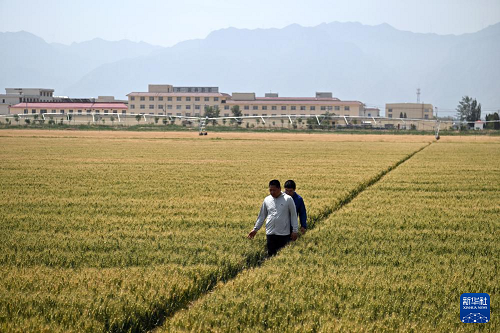 賈俊杰(前)和農業(yè)技術員在麥田里查看小麥生長情況(5月21日攝)。(新華社記者 詹彥 攝)