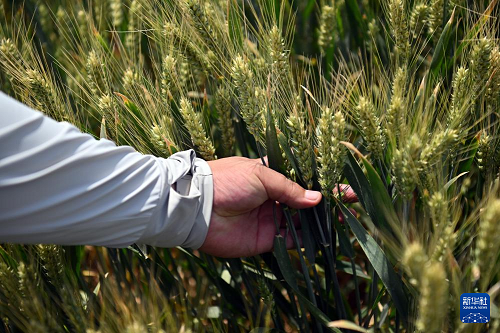 賈俊杰在永濟市虞鄉(xiāng)鎮(zhèn)麥田里查看麥粒飽滿度(5月21日攝)。(新華社記者 詹彥 攝)