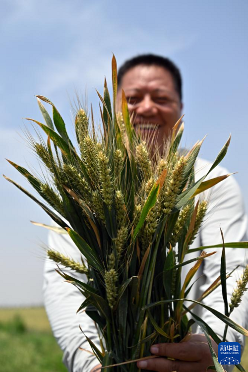 在永濟市虞鄉(xiāng)鎮(zhèn)麥田里,賈俊杰展示沉甸甸的麥穗(5月21日攝)。(新華社記者 詹彥 攝)