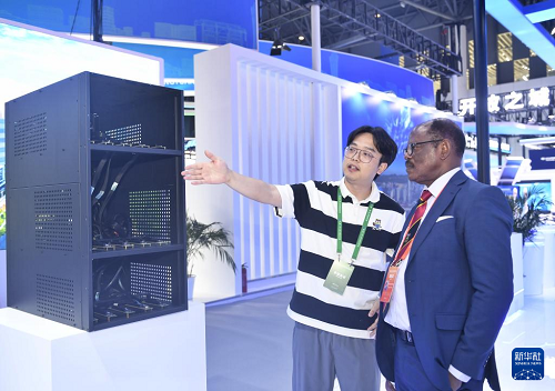 6月11日,參展商在向外賓介紹展出的高性能GPU服務器。(新華社記者 劉坤 攝)