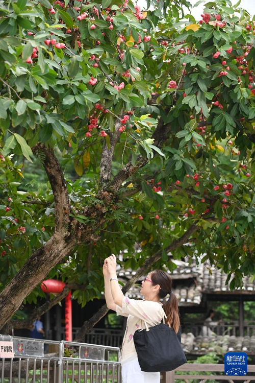 6月29日,在廣西南寧市古城路,市民在拍攝一棵結(jié)果的蓮霧樹。(新華社記者 陸波岸 攝)