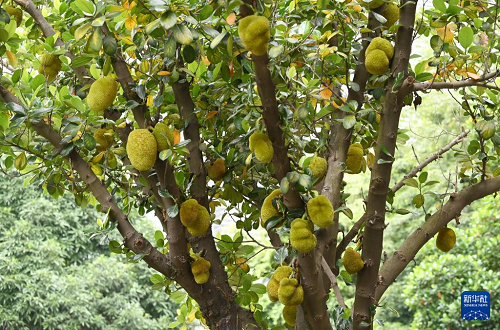 這是6月29日在南寧市金浦路拍攝的結(jié)果的木菠蘿樹。(新華社記者 陸波岸 攝)