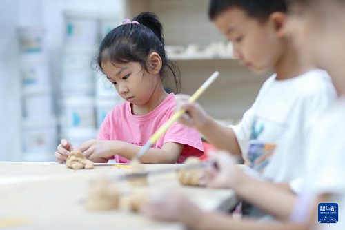 7月8日,在江蘇省興化市昭陽街道,小朋友在老師指導(dǎo)下制作陶藝作品。(新華社發(fā) 周社根 攝)