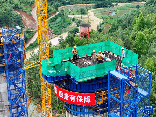 7月9日,工作人員對橋墩進行最后的混凝土澆筑(無人機照片)。(新華社記者 劉續(xù) 攝)