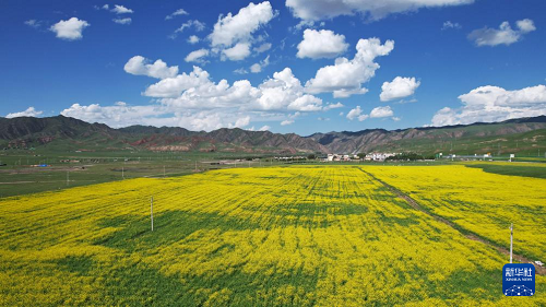 7月10日在桑科草原拍攝的油菜花海(無人機(jī)照片)。(新華社記者 魚瀾 攝)