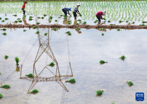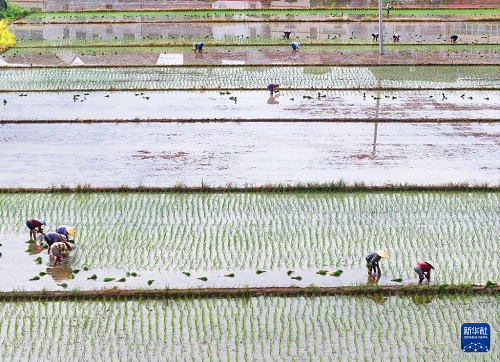 7月13日,湖南省衡陽市衡東縣霞流鎮(zhèn)農民在搶插晚稻(無人機照片)。(新華社發(fā) 曹正平 攝)