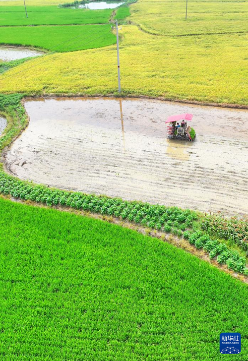 7月13日,湖南省衡陽市衡東縣霞流鎮(zhèn)農民駕駛農機進行晚稻插秧工作(無人機照片)。(新華社發(fā) 曹正平 攝)
