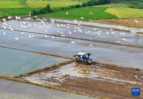 7月13日,湖南省衡陽市衡東縣霞流鎮(zhèn)農民駕駛農機翻耕稻田(無人機照片)。(新華社發(fā) 曹正平 攝)